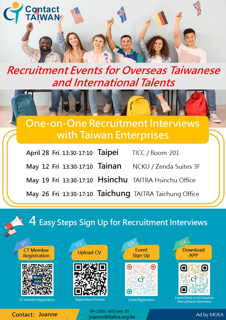 經濟部為協助僑外生畢業後,能繼續留在台灣,學以致用,同時協助國內企業掌握海外人才及在臺僑外生之人力資源,將邀請在臺僑外生、華僑及外籍人士等參加,與企業在現場進行一對一面談。藉由這次就業媒合會提供機會給有志留在台灣工作的外籍生,與台灣企業進行面對面的交流與了解,以促進雙方的合作。此外,該活動還將提供相關的法律、就業資訊等相關說明,協助外籍生更好地了解在台灣就業的相關情況。