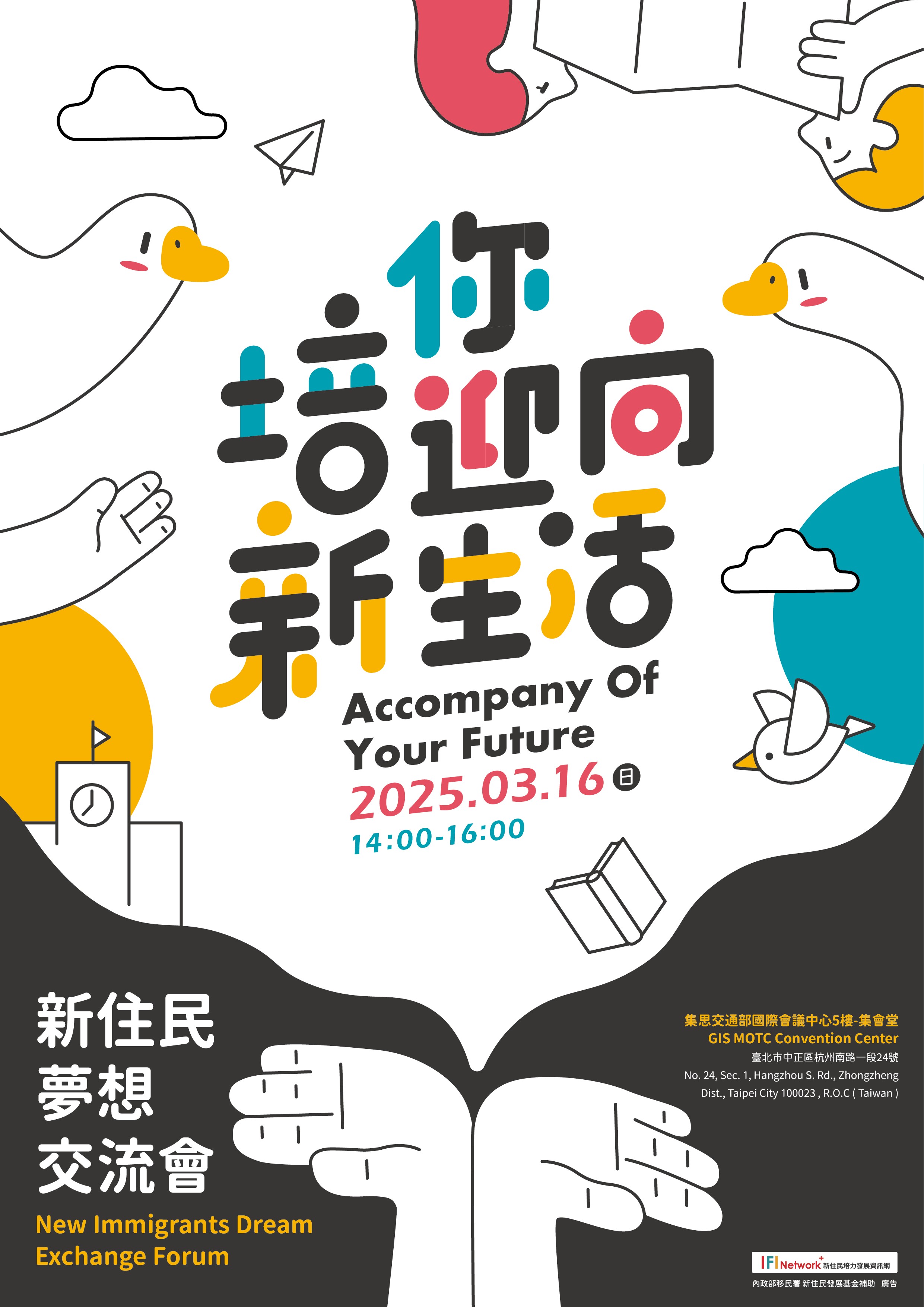 - 為整合中央及地方政府相關新住民資訊,內政部移民署建置新住民培力發展資訊網站(下稱培力網),提供7國語版服務(包含中、英、越、印、泰、柬、緬語),方便新住民查詢相關資訊,為擴大宣導培力網,爰規劃於114年3月16日(星期日)下午2時至4時,假集思交通部國際會議中心5樓集會堂(地址:臺北市中正區杭州南路一段24號5樓)辦理活動。