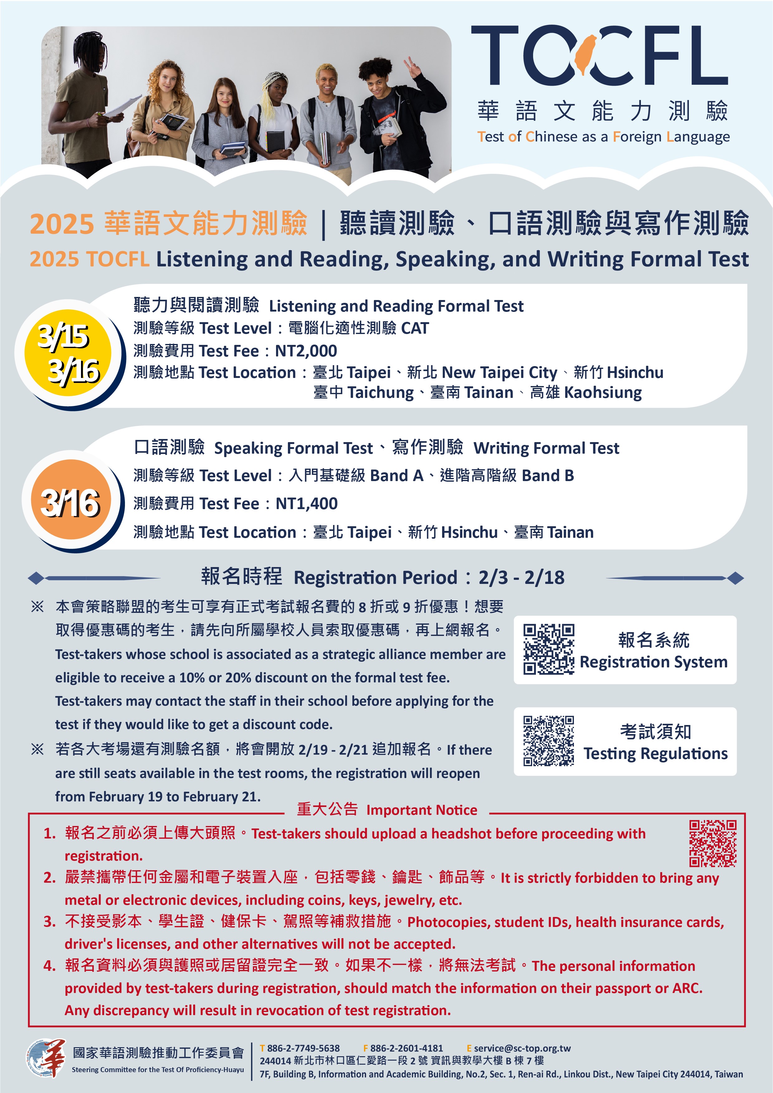 【轉知】「華語文能力測驗」114年3月正式考試事宜,敬請踴躍報考。