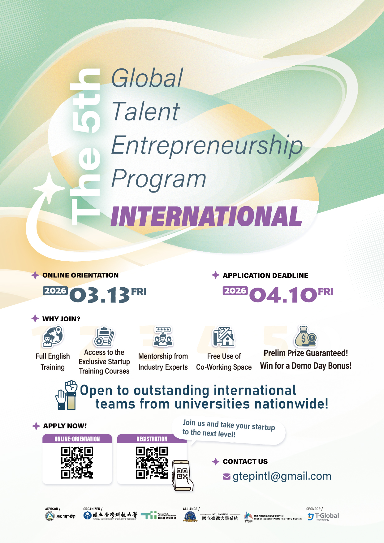 Are you an aspiring entrepreneur looking to take your startup to the next level? The 5th Global Talent Entrepreneurship Program (GTEP) is your gateway to top-tier training, mentorship, and international competition! From 2024, we're expanding GTEP to welcome the international teams from NTUST's sister schools and partner incubators. In 2026, GTEP-selected teams will compete with these global startups, fostering cross-cultural collaboration and innovation!